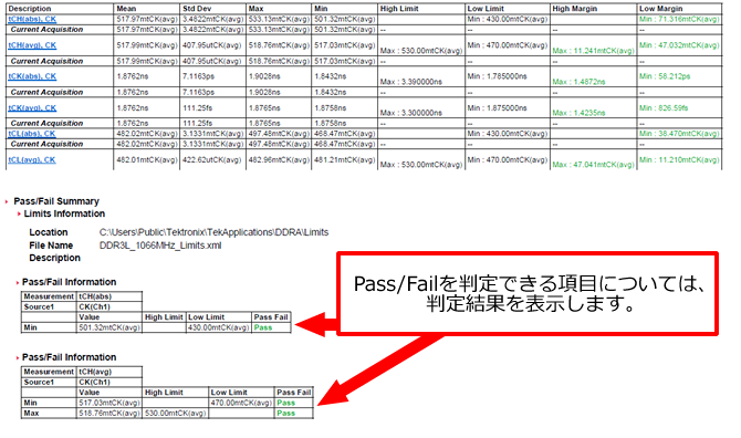 各項目の測定結果は、オシロスコープ上のアプリケーションソフトウェア「DDRA」より、ブラウザでご確認頂ける、*.mhtファイル形式でご提供致します。